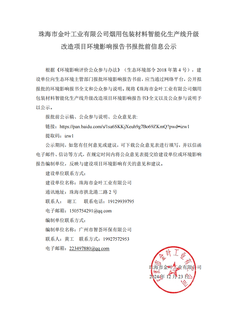 根据《中华人民共和国环境影响评价法》、《环境影响评价公众参与办法》(生态环境部令第4号)等相关规定,现对珠海市金叶工业有限公司烟用包装材料智能化生产线升级改造项目环境影响评价信息征求意见稿公示。项目概况及主要环境影响本项目对位于珠海市香洲区港二路2号现有项目厂内的3号楼(E113.5363°,N22.2309°)现有接装纸生产线进行升级改造,引入智能化设备以及一系列高端制造设备,开展印刷油墨多元化及接装纸生产全过程生产控制系统集成化、数字化及智能化改造,实现接装纸增产1200ta